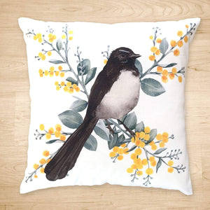 Willie Wagtail and Wattles Cushion Cover single bird Cotton Drill