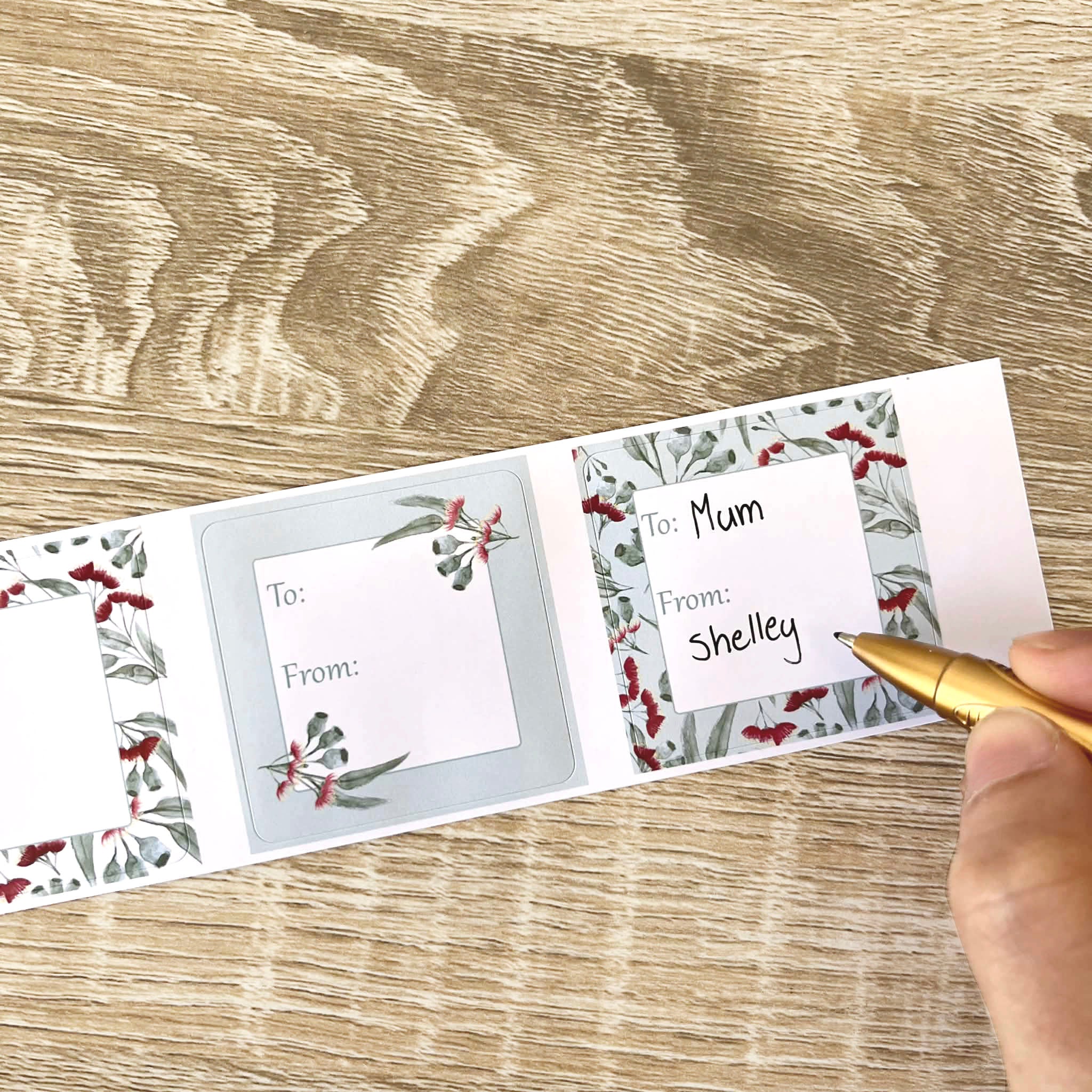 Just write the names, peel off, and stick onto gifts, bags, boxes, or wrapping paper.